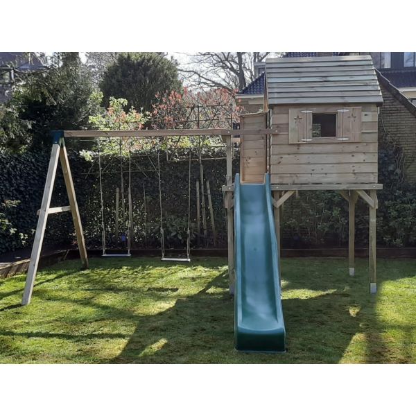 Hoewel alle houten onderdelen onder hoge druk geïmpregneerd zijn, blijft het hout gevoelig voor (overmatig) vocht. Wij adviseren derhalve een steenachtige ondergrond. Wanneer het speeltoestel op het gazon (of andere vochtige ondergrond) komt te staan, raden wij aan een plateau van betontegels aan te leggen ter grootte van het speeltoestel. Een aantal tegels onder de dragende punten het speeltoestel zijn eventueel ook voldoende. Zorg hierbij dat de ondergrond waterpas is!
