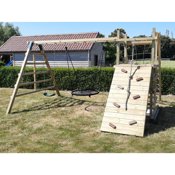 Hoewel alle houten onderdelen onder hoge druk geïmpregneerd zijn, blijft het hout gevoelig voor (overmatig) vocht. Wij adviseren derhalve een steenachtige ondergrond. Wanneer het speeltoestel op het gazon (of andere vochtige ondergrond) komt te staan, raden wij aan een plateau van betontegels aan te leggen ter grootte van het speeltoestel. Een aantal tegels onder de dragende punten het speeltoestel zijn eventueel ook voldoende. Zorg hierbij dat de ondergrond waterpas is!