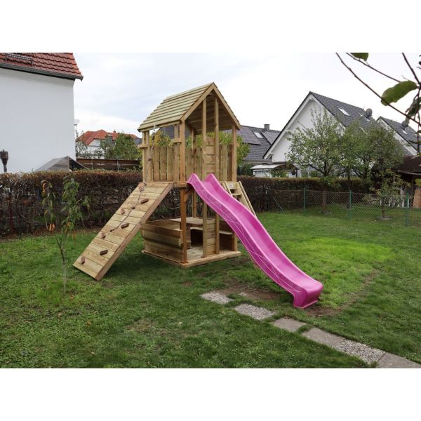Standard wird das Spielhaus mit einer Treppe mit flachen Antirutschstufen und der Rutschbahn an der Vorderseite geliefert. Es besteht jedoch die Möglichkeit nach Absprache und gegen einen geringen Aufpreis, die Treppe und die Rutschbahn, seitlich oder an der Rückseite an zu bringen.