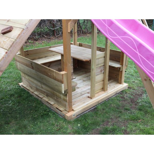 Die Unterseite des Spielturmes ist mit einem Holzboden ausgestattet. Die große Banke im Spielhaus bieten die perfekte Gelegenheit um mit ihren Kindern zusammen z.B. ein schönes Picknick zu machen. Die Bänke bieten Platz für bis zu 9 Kinder.