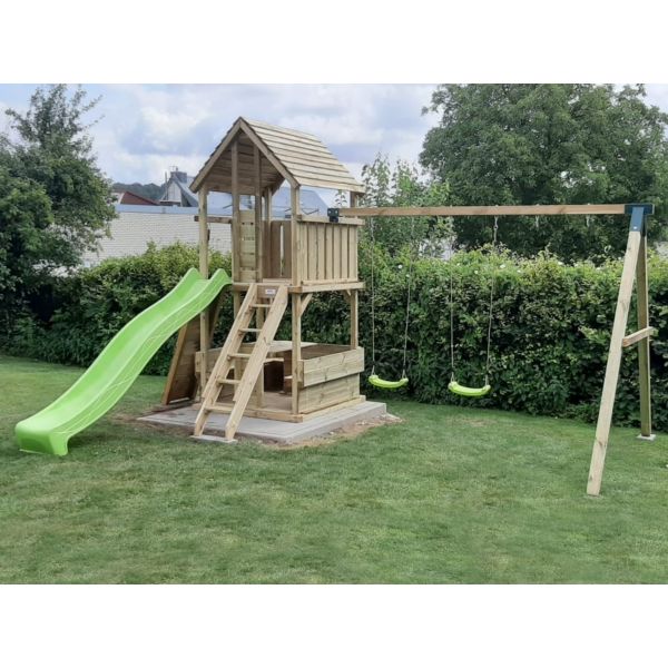 Sie können den Spielturm selbst mit zusätzlichen Teilen (Anbauschaukel, Kletterwand usw.) oder Extras erweitern. Vergessen Sie nicht, die Schaukelsitze und einige schöne Accessoires zu bestellen!
