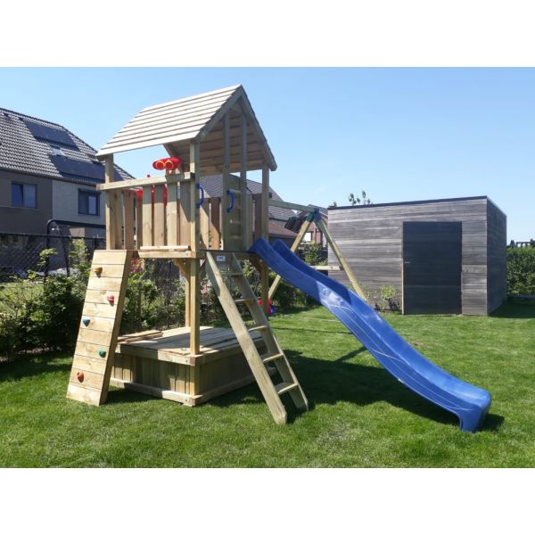 Hoewel alle houten onderdelen onder hoge druk geïmpregneerd zijn, blijft het hout gevoelig voor (overmatig) vocht. Wij adviseren derhalve een steenachtige ondergrond. Wanneer het speeltoestel op het gazon (of andere vochtige ondergrond) komt te staan, raden wij aan een plateau van betontegels aan te leggen ter grootte van het speeltoestel. Een aantal tegels onder de dragende punten het speeltoestel zijn eventueel ook voldoende. Zorg hierbij dat de ondergrond waterpas is!