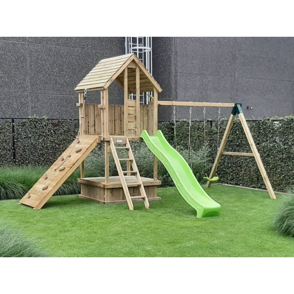 Sie können den Spielturm selbst mit zusätzlichen Teilen (Anbauschaukel, Kletterwand usw.) oder Extras erweitern. Vergessen Sie nicht die Sandkastendeckel, Schaukelsitze und einige schöne Accessoires zu bestellen!
