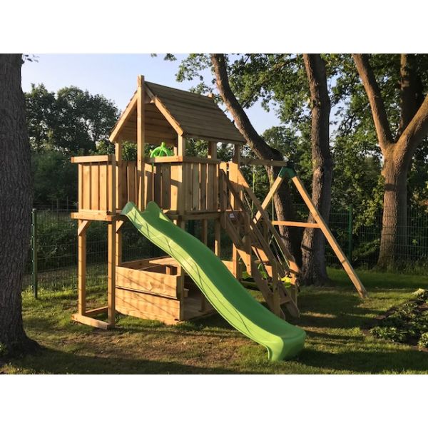 Der Spielturm Amsterdam ist ein Spielturm 150 mit ein extra Balkon. An dieser extra balkon kann man die Treppe oder Rutsche anbringen. Dies hat den Vorteil, dass die Rutschbahn nicht so weit in den Garten komt.