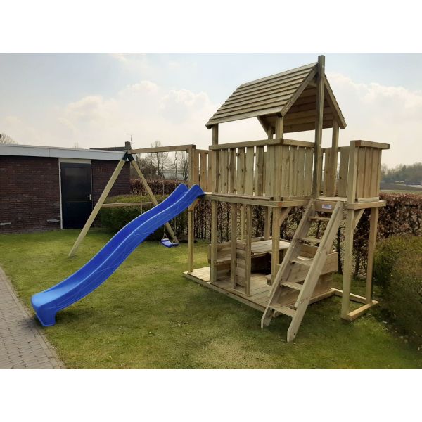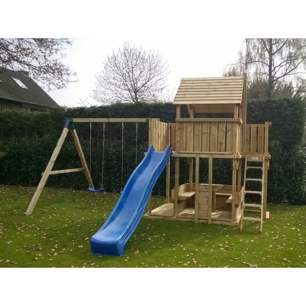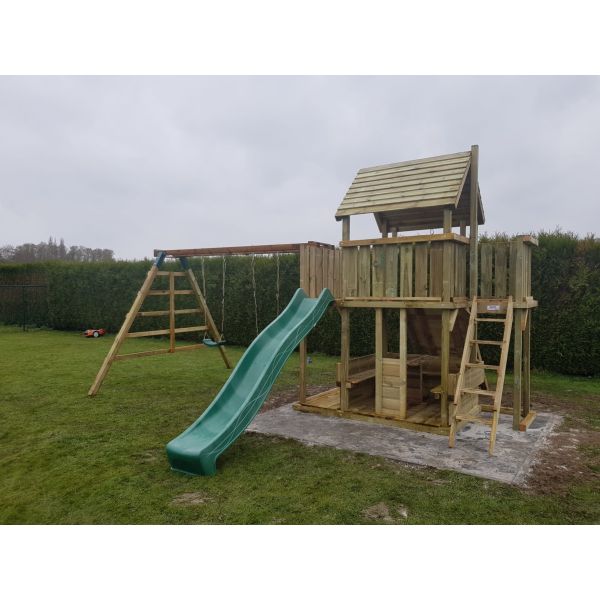 Hoewel alle houten onderdelen onder hoge druk geïmpregneerd zijn, blijft het hout gevoelig voor (overmatig) vocht. Wij adviseren derhalve een steenachtige ondergrond. Wanneer het speeltoestel op het gazon (of andere vochtige ondergrond) komt te staan, raden wij aan een plateau van betontegels aan te leggen ter grootte van het speeltoestel. Een aantal tegels onder de dragende punten het speeltoestel zijn eventueel ook voldoende. Zorg hierbij dat de ondergrond waterpas is!