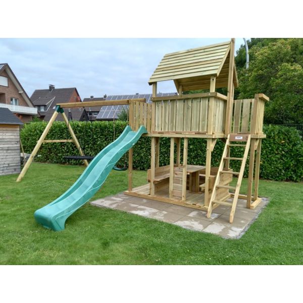 Standard wird dieser Spielturm mit einer Treppe mit flachen Antirutschstufen und der Rutschbahn ander der Vorderseite ausgestattet.