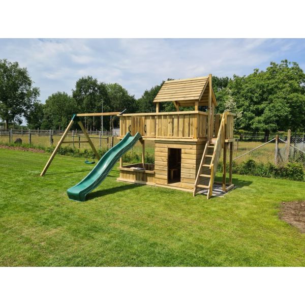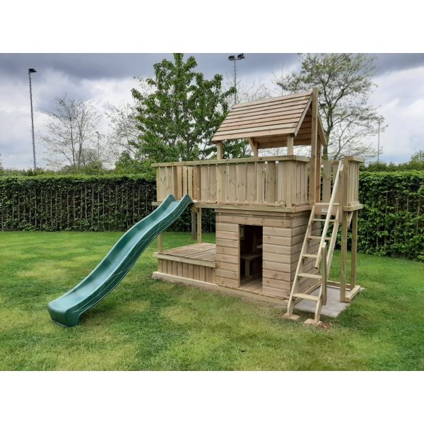 Hoewel alle houten onderdelen onder hoge druk geïmpregneerd zijn, blijft het hout gevoelig voor (overmatig) vocht. Wij adviseren derhalve een steenachtige ondergrond. Wanneer het speeltoestel op het gazon (of andere vochtige ondergrond) komt te staan, raden wij aan een plateau van betontegels aan te leggen ter grootte van het speeltoestel. Een aantal tegels onder de dragende punten het speeltoestel zijn eventueel ook voldoende. Zorg hierbij dat de ondergrond waterpas is!