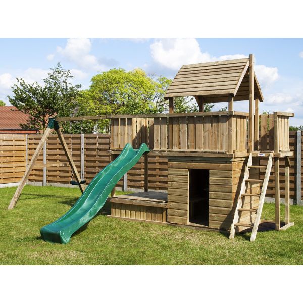 Sie können den Spielturm selbst mit zusätzlichen Teilen (Anbauschaukel, Kletterwand usw.) oder Extras (Geländer, Fensteräden, Tür, Sandkastendeckel usw.) erweitern.