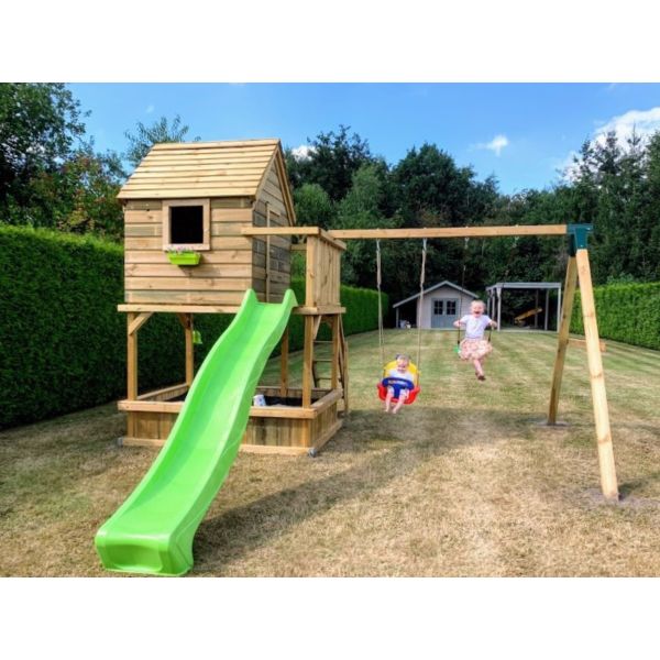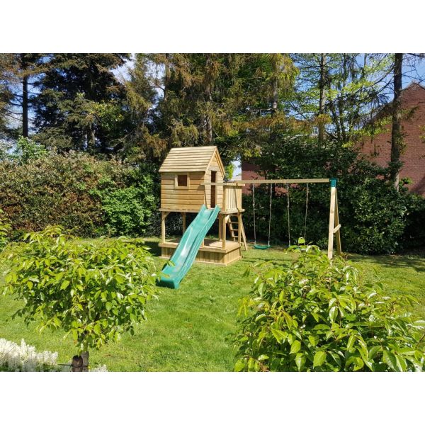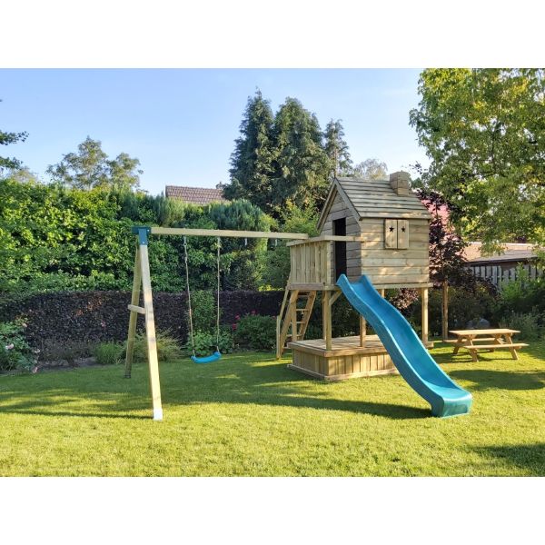 Hoewel alle houten onderdelen onder hoge druk geïmpregneerd zijn, blijft het hout gevoelig voor (overmatig) vocht. Wij adviseren derhalve een steenachtige ondergrond. Wanneer het speeltoestel op het gazon (of andere vochtige ondergrond) komt te staan, raden wij aan een plateau van betontegels aan te leggen ter grootte van het speeltoestel. Een aantal tegels onder de dragende punten het speeltoestel zijn eventueel ook voldoende. Zorg hierbij dat de ondergrond waterpas is!