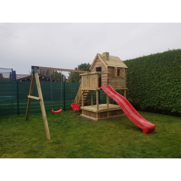 Der Spielturm Duisburg ist ein Spielturm 150 mit ein extra groß Balkon und geschlossen Spielhaus an obenseite. An dieser extra balkon sind die Treppe und Rutsche montiert. Dieses Balkon hat den Vorteil, dass dvon der Treppe bis zur Rutsche, mann nicht durch das Spielhaus muss.