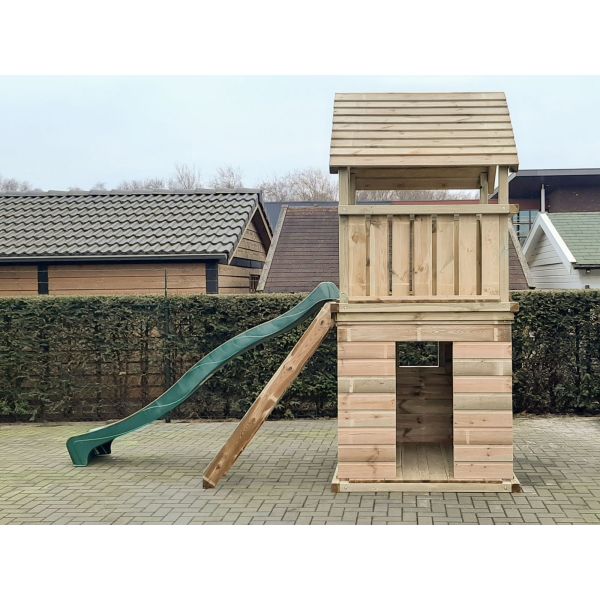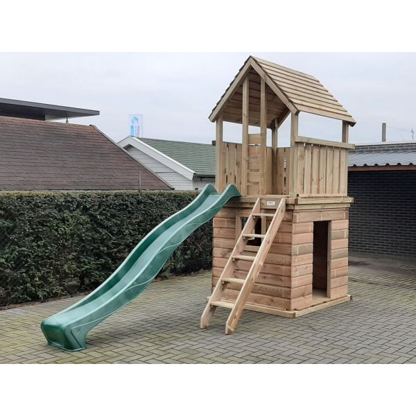 Hoewel alle houten onderdelen onder hoge druk geïmpregneerd zijn, blijft het hout gevoelig voor (overmatig) vocht. Wij adviseren derhalve een steenachtige ondergrond. Wanneer het speeltoestel op het gazon (of andere vochtige ondergrond) komt te staan, raden wij aan een plateau van betontegels aan te leggen ter grootte van het speeltoestel. Een aantal tegels onder de dragende punten het speeltoestel zijn eventueel ook voldoende. Zorg hierbij dat de ondergrond waterpas is!