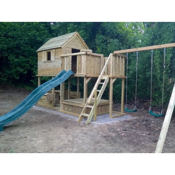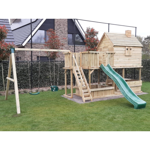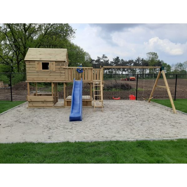 Hoewel alle houten onderdelen onder hoge druk geïmpregneerd zijn, blijft het hout gevoelig voor (overmatig) vocht. Wij adviseren derhalve een steenachtige ondergrond. Wanneer het speeltoestel op het gazon (of andere vochtige ondergrond) komt te staan, raden wij aan een plateau van betontegels aan te leggen ter grootte van het speeltoestel. Een aantal tegels onder de dragende punten het speeltoestel zijn eventueel ook voldoende. Zorg hierbij dat de ondergrond waterpas is!