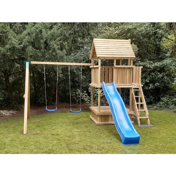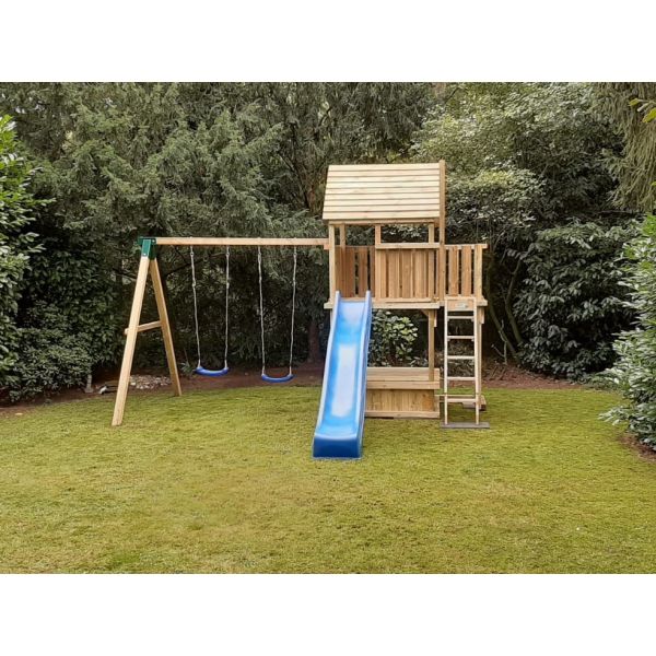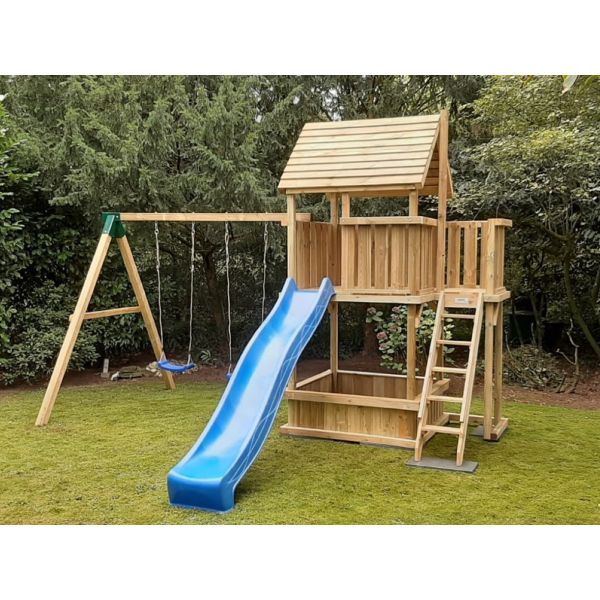 Der Spielturm Amsterdam ist ein Spielturm 150 mit ein extra Balkon. An dieser extra balkon kann man die Treppe oder Rutsche anbringen. Dies hat den Vorteil, dass die Rutschbahn nicht so weit in den Garten komt.