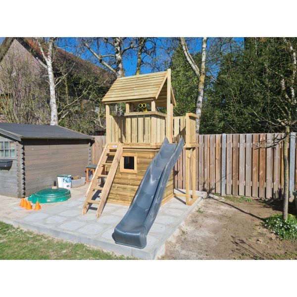 Hoewel alle houten onderdelen onder hoge druk geïmpregneerd zijn, blijft het hout gevoelig voor (overmatig) vocht. Wij adviseren derhalve een steenachtige ondergrond. Wanneer het speeltoestel op het gazon (of andere vochtige ondergrond) komt te staan, raden wij aan een plateau van betontegels aan te leggen ter grootte van het speeltoestel. Een aantal tegels onder de dragende punten het speeltoestel zijn eventueel ook voldoende. Zorg hierbij dat de ondergrond waterpas is!