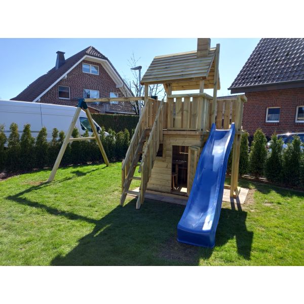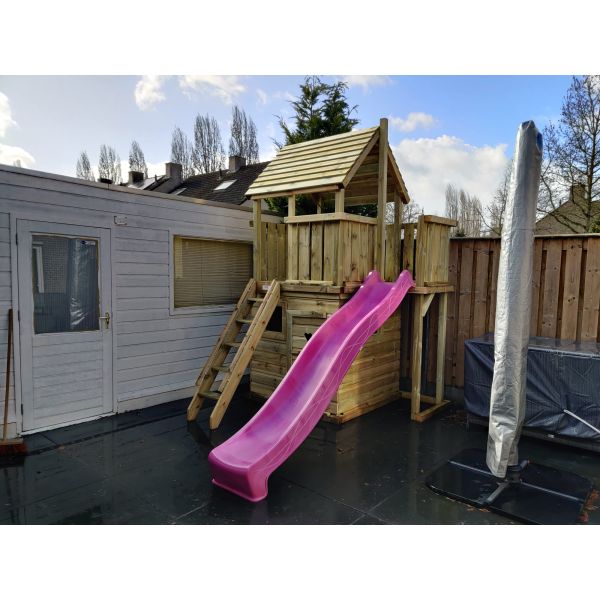 Der Spielturm Amsterdam ist ein Spielturm 150 mit ein extra Balkon. An dieser extra balkon kann man die Treppe oder Rutsche anbringen. Dies hat den Vorteil, dass die Rutschbahn nicht so weit in den Garten komt.