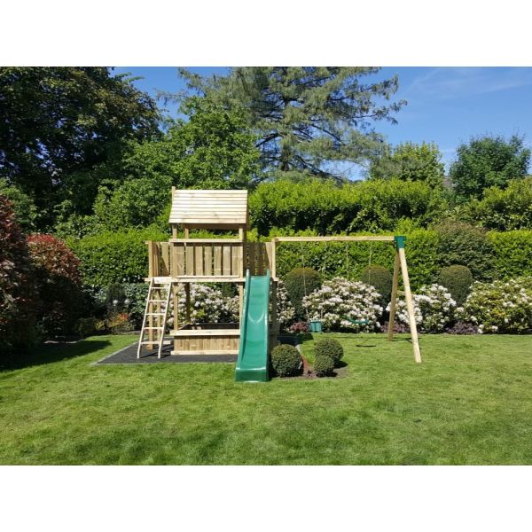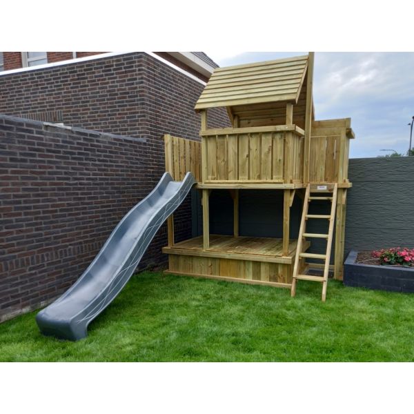 Hoewel alle houten onderdelen onder hoge druk geïmpregneerd zijn, blijft het hout gevoelig voor (overmatig) vocht. Wij adviseren derhalve een steenachtige ondergrond. Wanneer het speeltoestel op het gazon (of andere vochtige ondergrond) komt te staan, raden wij aan een plateau van betontegels aan te leggen ter grootte van het speeltoestel. Een aantal tegels onder de dragende punten het speeltoestel zijn eventueel ook voldoende. Zorg hierbij dat de ondergrond waterpas is!