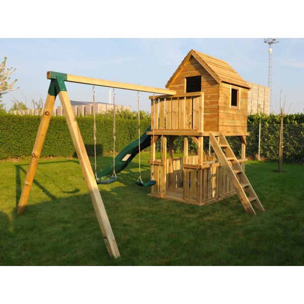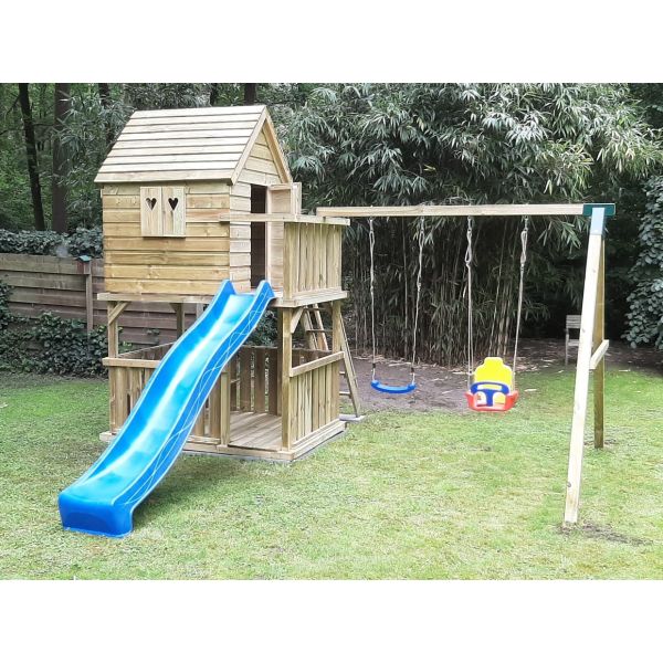 Hoewel alle houten onderdelen onder hoge druk geïmpregneerd zijn, blijft het hout gevoelig voor (overmatig) vocht. Wij adviseren derhalve een steenachtige ondergrond. Wanneer het speeltoestel op het gazon (of andere vochtige ondergrond) komt te staan, raden wij aan een plateau van betontegels aan te leggen ter grootte van het speeltoestel. Een aantal tegels onder de dragende punten het speeltoestel zijn eventueel ook voldoende. Zorg hierbij dat de ondergrond waterpas is!