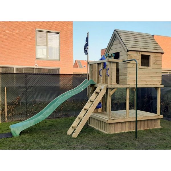 Der Spielturm Duisburg ist ein Spielturm 150 mit ein extra groß Balkon und geschlossen Spielhaus an obenseite. An dieser extra balkon sind die Treppe und Rutsche montiert. Dieses Balkon hat den Vorteil, dass dvon der Treppe bis zur Rutsche, mann nicht durch das Spielhaus muss.